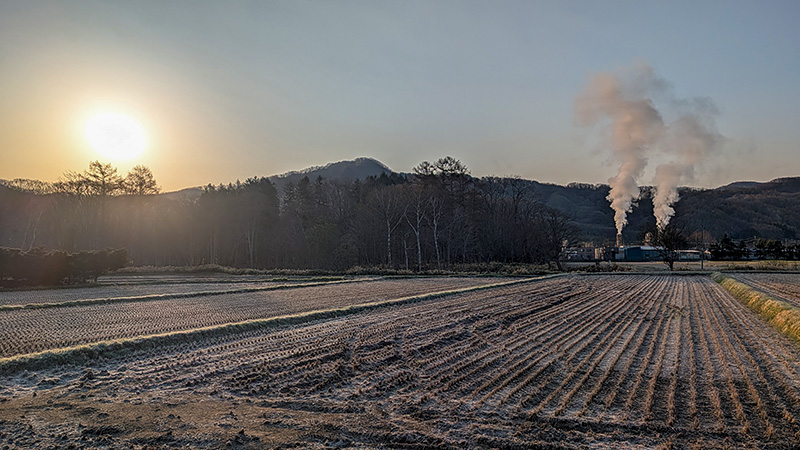 今回の宿泊地である濁川温泉の朝 明け方は氷点下まで下がったようだ