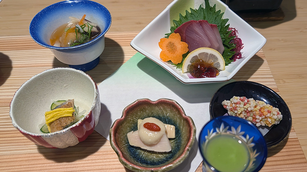 日田温泉 はなの樹 RIVER TERRACE 六種盛り ・うざく ・濃い甘酢あんかけ ・えび五色揚げあられ ・竹の子しらがけ ・グリーンピースすり流し ・かぼす鰤