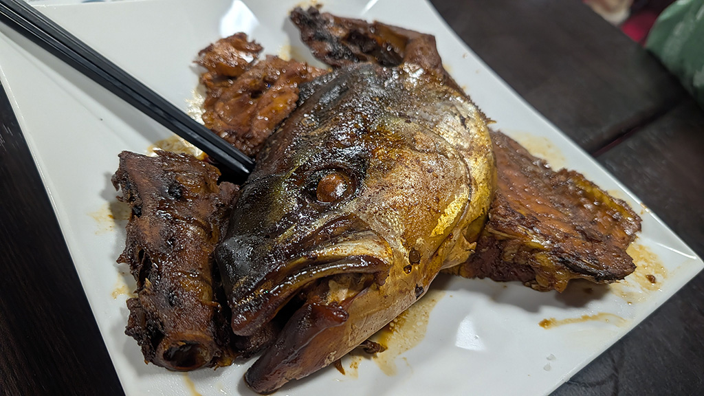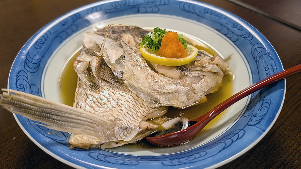 旅館 海望荘 鯛の兜煮 島原の味付けらしく、酢が加えられていたが、その為か生臭さは一切なく非常に美味であった