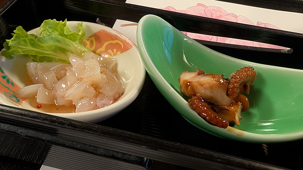 土瓶蒸しの悪いところは蕎麦前のヌキと同じように、液体が酒の肴になるところだ。つまり、酒が進んでしまうということ。土瓶蒸しとしては具はシンプルであったけど、逆に味で勝負的な潔さを感じた。土瓶蒸しに限らずこちらの宿で食べた夕食はどれも美味しく、下の写真も自分好みの味で満足。