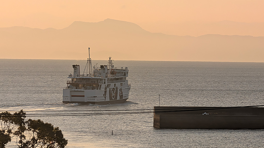 島原にて 島原半島と熊本側を結ぶ航路は複数あり、有明海沿いを走るより効率的である。船体に熊本のキャラであるくまモンが描かれている。