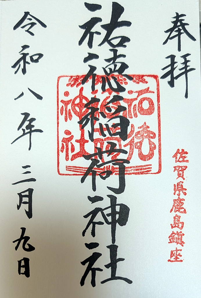 祐徳稲荷神社 御朱印 書き置きもあるが、こちらの神社では直書きする神職が複数おられるようで、参拝毎に御朱印の字が変わる。